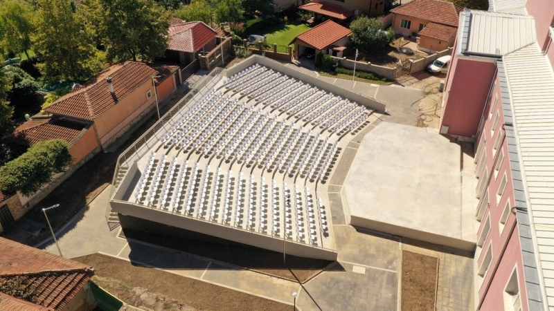 Цялостно изграждане на открит Амфитеатър с 540 места, предназначен за масови събития на открито. Амфитеатърът се състои от две части, сцена и трибуна. Конструкцията на сцената е с площ 145 м2., а на трибунната е 472 м2. Конзолни евакуационни стълби, свързват трибуната със сутерена. На кота -0,39 са разположени 14 санитарни помещения с отделни предверия, складова част и ГРТ. Изградена е цялостна ОВК, Електро и ВиК инсталации. Вертикалната планировка включва изграждане на достъпна среда и 430 м2 гранитни ивици и плочи от мит бетон.